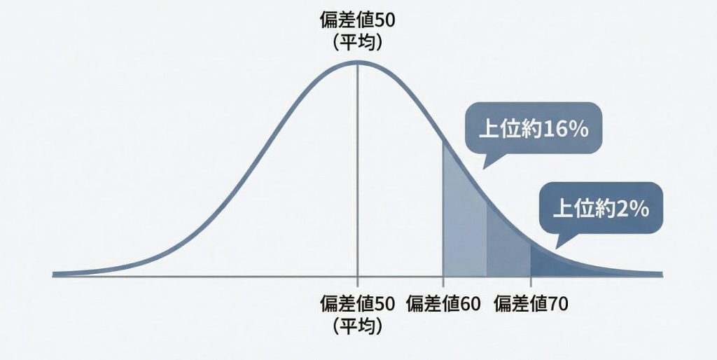 偏差値50が平均にあたり、60以上になると上位約16%、70以上では上位約2%に相当するとされています。